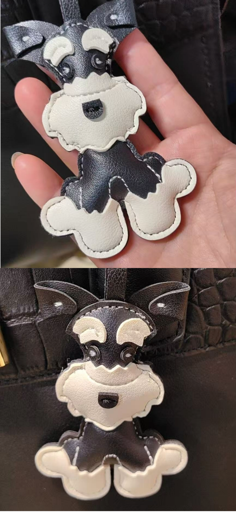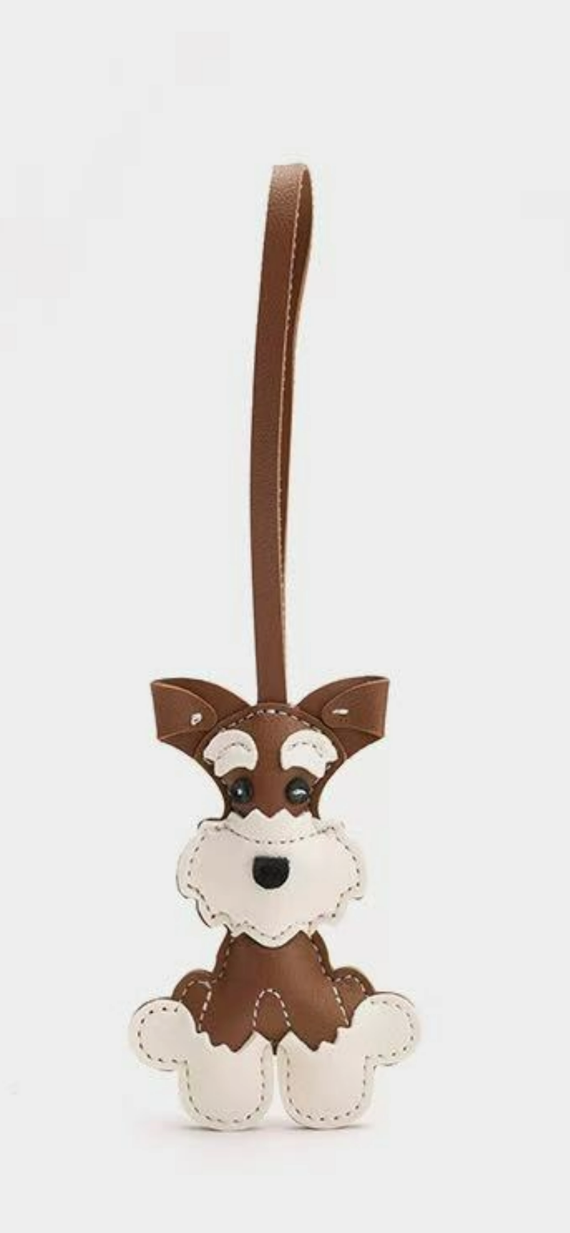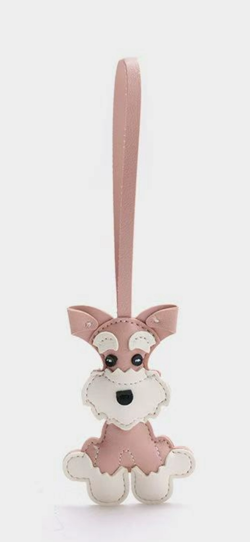 Super cute Schnauzer charms in black, brown, and pink. Perfect for hanging on bags or using as keychains, with an overall length of 21cm (including cord). Stylish and playful. Made with vegan-friendly materials.