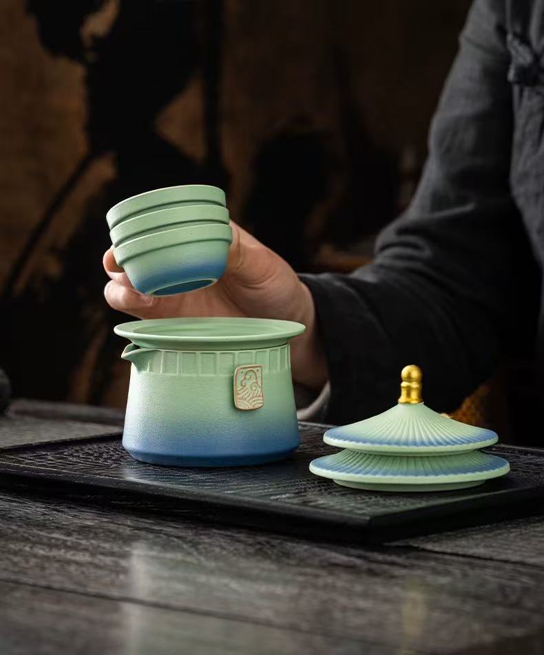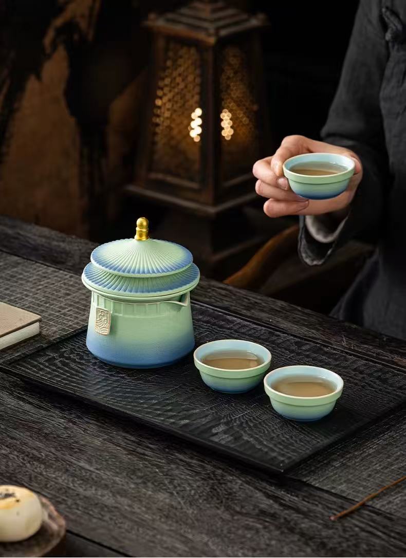 This cleverly designed tea set, inspired by the architecture of the Forbidden City, includes a teapot, teacups, and a tea strainer. The lid doubles as a teacup holder, the cups can be stacked inside the teapot, and the tea strainer is made from 304 food-grade stainless steel. The turquoise color, a traditional Chinese color, embodies the tranquil and indifferent spirit of the tea ceremony. This set is perfect for travel and comes with a protective case.